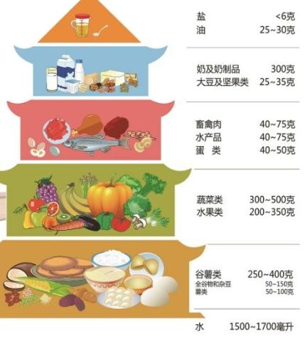 蔬菜保證每天攝入300至500克,深色蔬菜應(yīng)占1/2;水果保證每天攝入200至350克,果汁不能代替鮮果;奶制品攝入量相當(dāng)于每天液態(tài)奶300克;豆制品每天攝入量相當(dāng)于大豆25克以上,適量吃堅果。