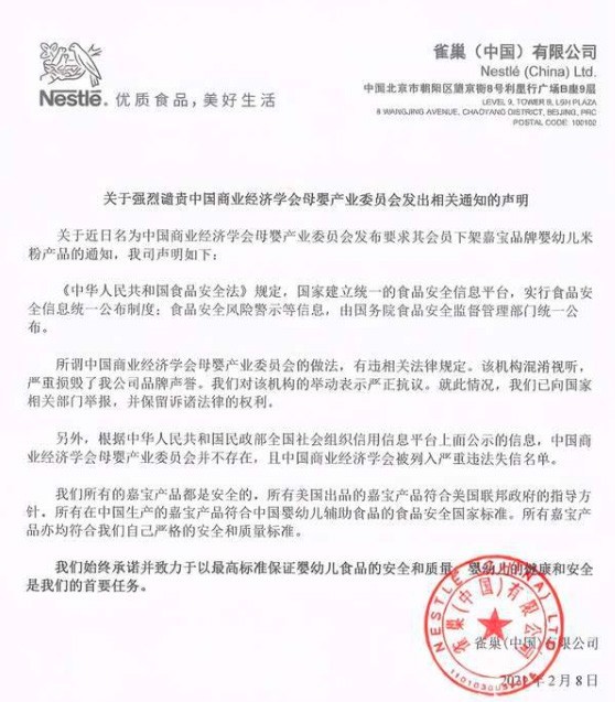 本來(lái)也沒(méi)多大的事,結(jié)果有個(gè)叫做“中國(guó)商業(yè)經(jīng)濟(jì)學(xué)會(huì)母嬰產(chǎn)業(yè)委員會(huì)”的機(jī)構(gòu)跳出來(lái),給會(huì)員單位發(fā)通知,對(duì)相關(guān)產(chǎn)品“責(zé)令下架”。一個(gè)嚴(yán)重失信機(jī)構(gòu)居然有這么大的官威,我也是 real 服氣。他們可能訛人訛慣了,沒(méi)想到這次碰了個(gè)釘子,雀巢畢竟是全球第一大食品公司,以為人家食品法規(guī)和質(zhì)量部門是擺設(shè)???雀巢馬上發(fā)了一個(gè)強(qiáng)烈譴責(zé)的聲明,“來(lái)剛我啊”。