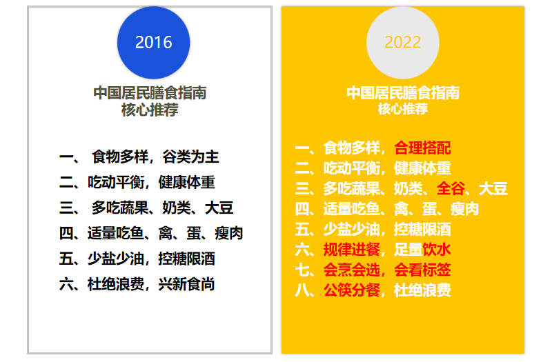 今天最新的《中國居民膳食指南(2022)》發(fā)布,與上一版的指南相比,也有了一些變化,包括核心 8 條提示、增加了新的建議,大家可以看下圖 :