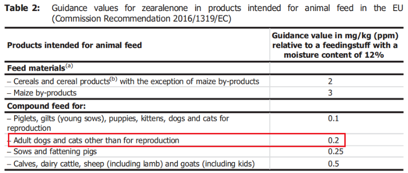 食品有真菌毒素限量,飼料也有。比如中國通用的《飼料衛(wèi)生標(biāo)準(zhǔn)》中的ZEN限量是500ppb(即微克每公斤),《寵物飼料衛(wèi)生規(guī)定》中成犬飼料的ZEN限量為250ppb。網(wǎng)上有些人對“產(chǎn)品符合(中國)國家標(biāo)準(zhǔn)”嗤之以鼻,更推崇歐美標(biāo)準(zhǔn)。但是最保守、最嚴(yán)格、動物福利最完善的歐盟的標(biāo)準(zhǔn),狗糧ZEN的限量也是200ppb,和中國差不多。