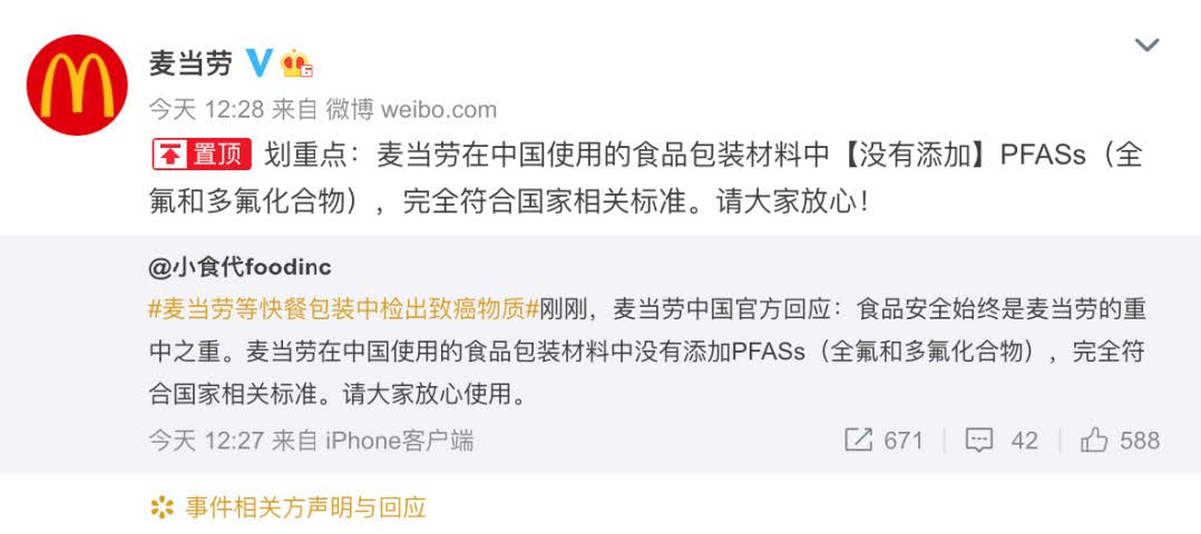 目前,麥當勞和漢堡王均已回應(yīng):在中國使 用的食品包裝材料中沒有添加 PFASs,完全符合國 家相關(guān)標準。請大家放心!