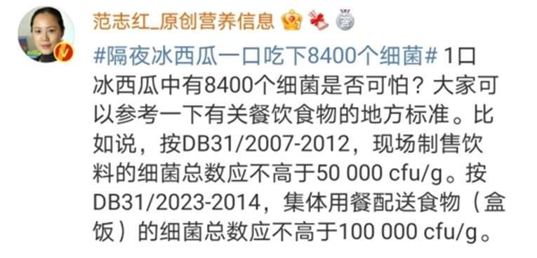 我們的環(huán)境中充滿了細(xì)菌,食物中也充滿了細(xì)菌。節(jié)目中“最不衛(wèi)生”的那個操作,西瓜放隔夜后的細(xì)菌數(shù)是 8400 個 /25 克,也就是 336 個 / 克。
