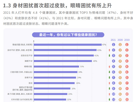 第二,在各類健康困擾中,人們對(duì)身材的關(guān)注首次超過皮膚,排名第二,這其中主要是肥胖相關(guān)的身材困擾。