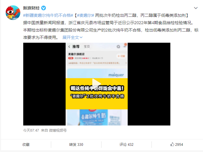 6 月 30 日,“新疆麥趣爾純牛奶不合格”的詞條一度沖上微博熱搜第一。據(jù)中國質(zhì)量新聞網(wǎng)報(bào)道,近日,浙江省慶元縣市場監(jiān)管局公示的 2022 年第 4 期食品抽檢檢驗(yàn)情況中稱,麥趣爾集團(tuán)股份有限公司(下稱“麥趣爾”)生產(chǎn)的 2批次純牛奶不合格,不合格項(xiàng)目為丙二醇。