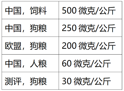 食品有真菌毒素限量,飼料也有。比如中國通用的《飼料衛(wèi)生標(biāo)準(zhǔn)》中的ZEN限量是500ppb(即微克每公斤),《寵物飼料衛(wèi)生規(guī)定》中成犬飼料的ZEN限量為250ppb。網(wǎng)上有些人對“產(chǎn)品符合(中國)國家標(biāo)準(zhǔn)”嗤之以鼻,更推崇歐美標(biāo)準(zhǔn)。但是最保守、最嚴(yán)格、動物福利最完善的歐盟的標(biāo)準(zhǔn),狗糧ZEN的限量也是200ppb,和中國差不多。