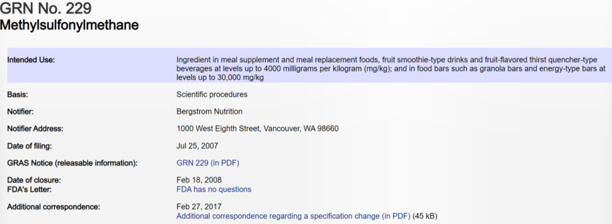 MSM 并不是新東西,它天然存在于人體以及動物體內(nèi),包括果蔬在內(nèi)的植物中也廣泛存在,甚至 在海洋空氣中都能檢測到。美國 FDA 曾于 2007 年對 MSM 的食用安全性進行評估并將它列為 GRAS 物質(zhì), 即“通常認為是安全的”,有點類似于中國的新食品原料。