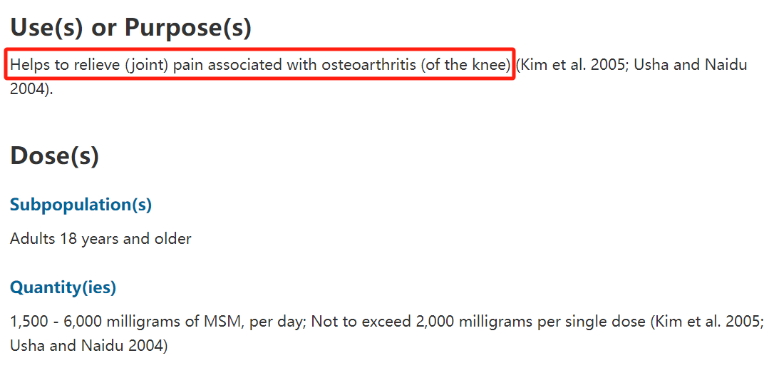 比如韓國規(guī)定使用 MSM 的產(chǎn)品可以標注“可能有助于關(guān)節(jié)和軟骨健康”。在加拿大,MSM 可以用于“緩 解骨松帶來的膝蓋疼痛”?;蛟S這也是網(wǎng)傳“MSM 是止痛藥”的源頭,但實際上它的緩解疼痛作用和止