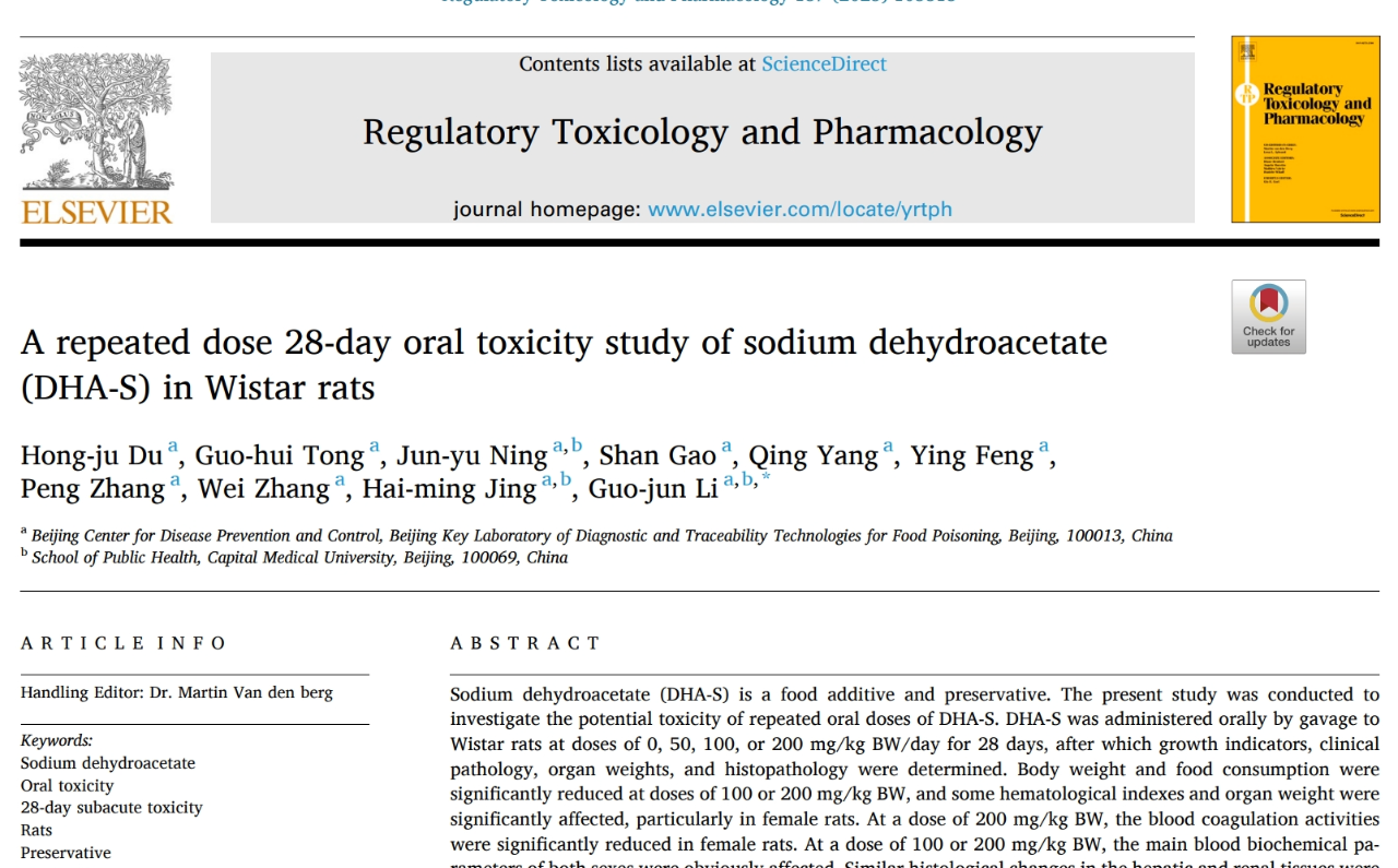 我國學(xué)者的動物實驗研究發(fā)現(xiàn),多次反復(fù)地大量食用脫氫乙酸鈉(200 mg/kg BW)可能造成大鼠取食減少、體重下降、凝血能力下降、肝腎組織變化等問題,在較高濃度情況(124.0 mg/kg BW多次反復(fù)暴露)還可能引起甲狀腺激素紊亂。這是一些「亞臨床」的損害,并不致死,但可能降低生命質(zhì)量。