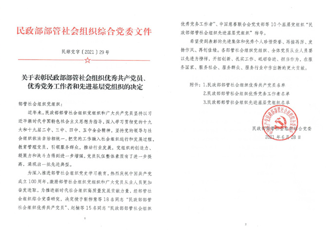 為深入推進(jìn)部管社會(huì)組織黨史學(xué)習(xí)教育,熱烈慶祝中國共產(chǎn)黨成立 100 周年,激勵(lì)部管社會(huì)組織黨組織和廣大黨員從業(yè)人員更加奮發(fā)進(jìn)取,為推進(jìn)新時(shí)代社會(huì)組織高質(zhì)量發(fā)展貢獻(xiàn)力量,6 月 29 日,民政部部管社會(huì)組織綜合黨委在京召開部管社會(huì)組織慶祝建黨 100 周年暨黨建工作經(jīng)驗(yàn)交流會(huì)。會(huì)上,部管社會(huì)組織綜合黨委宣讀了授予科信食品與健康信息交流中心黨支部為“先進(jìn)基層黨組織”,支部吳桐書記為“優(yōu)秀黨務(wù)工作者”,支部趙秀文同志為“優(yōu)秀共產(chǎn)黨員”等榮譽(yù)稱號(hào)文件,并進(jìn)行了集體表彰。