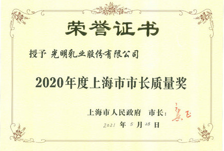 5 月 28 日上午,在 2021 年度上海市質(zhì)量工作會議上頒發(fā)了 2020 年度上海市政府質(zhì)量獎,光明乳業(yè)股份有限公司榮獲本市最高質(zhì)量榮譽