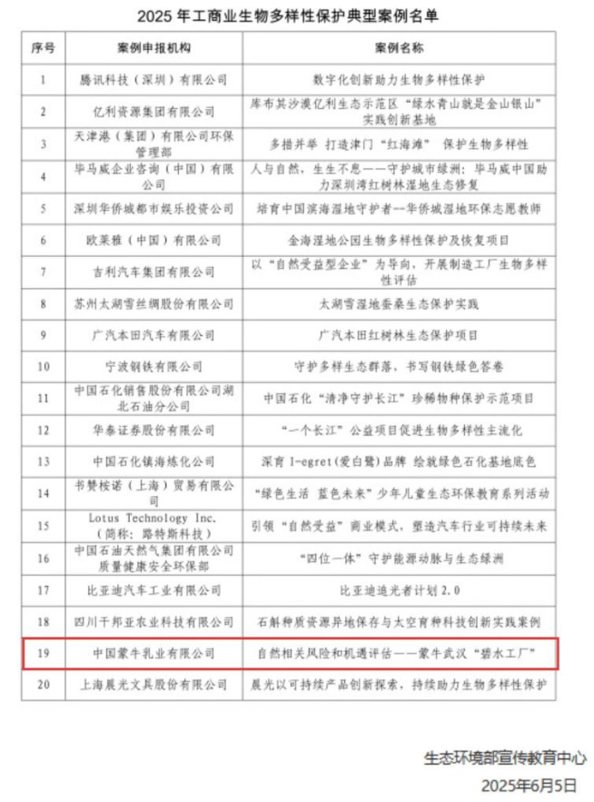 生態(tài)環(huán)境部宣傳教育中心公布了 2025 年工商業(yè)生物多樣性保護典型案例,蒙牛乳業(yè)《自然相關風險和機遇評估——蒙牛武漢“碧水工廠”》案例成功入選。這是乳品行業(yè)唯一獲評項目,彰顯了蒙牛在可持續(xù)發(fā)展領域的行業(yè)標桿地位。